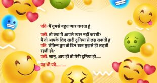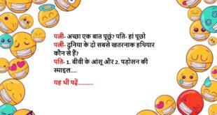 पति- क्यों मार रही हो बच्चे को? पत्नी- मैंने कहा पढ़ ले, अच्छी बीवी मिलेगी पति- तो इसमें मारने वाली क्या बात है? पत्नी- ये कहता है कि पापा भी तो खूब पढ़े लिखे थे……😆🤣🤣🤣🤣😝😝😝 ************************************************************************************ पत्नी (पति से)- कल हमारी शादी को पांच साल पूरे हो जाएंगे पति- तो फिर दुबारा चुनाव होंगे या फिर यही सरकार चलेगी….😆🤣🤣🤣🤣😝😝😝 ************************************************************************************ …