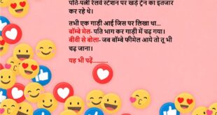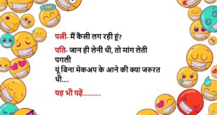 पत्नी- तबीयत खराब सी लग रही है पति- ओह नो, मैं सोच रहा था के हम आज डिनर कही बाहर करते पत्नी- अरे मैं तो मजाक कर रही थी पति- मैं भी मजाक कर रहा था शाबाश चल उठ रोटी बना…..😆🤣🤣🤣🤣😝😝😝 ************************************************************************************ पत्नी के मायके से वापस आते ही दरवाजा खोलते ही हंसने लगा पति पत्नी- ऐसे क्यों हंस रहे …