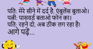 बंता: तेरी शादी 2 साल पहले हुई थी ना? संता: हां, लेकिन अभी तक हनीमून पर नहीं गए। बंता: क्यों? संता: बीवी अभी पैकिंग कर रही है! 🤣 ***************************************** टीचर: 15 फलों के नाम बताओ। संता: आम, केला, अमरूद… टीचर: शाबाश, 12 और! संता: एक दर्जन केले! 🍌😂 ***************************************** पति: मेरे सीने में दर्द है, एंबुलेंस बुलाओ। पत्नी: पासवर्ड बताओ …