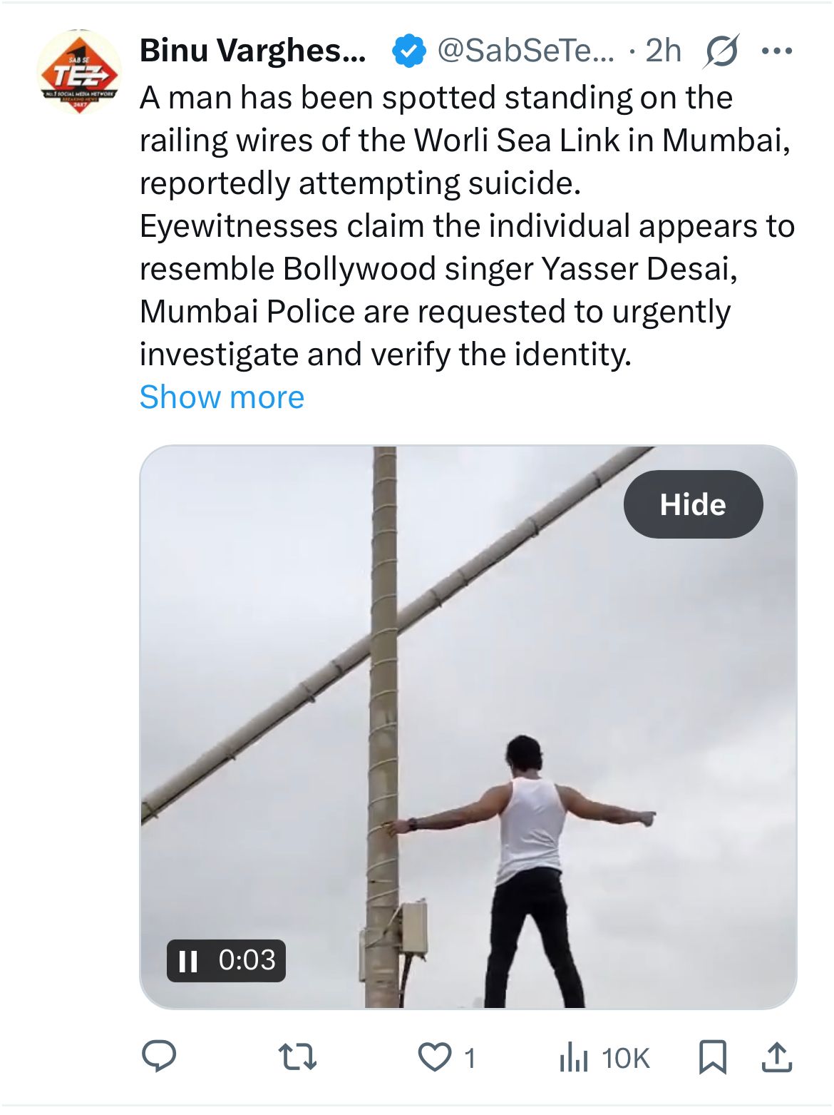 “मुंबई के वर्ली सी लिंक पर एक व्यक्ति को रेलिंग की तारों पर खड़े हुए देखा गया है, जो कथित तौर पर आत्महत्या करने की कोशिश कर रहा है। चश्मदीदों का कहना है कि यह व्यक्ति बॉलीवुड सिंगर यासर देसाई जैसा दिखता है। मुंबई पुलिस से निवेदन है कि इस मामले की तुरंत जांच कर पहचान की पुष्टि करें। यह दृश्य आज सुबह लगभग 8 बजे स्थानीय सूत्रों से प्राप्त हुए हैं। @मुंबईपुलिस @रोड्सऑफमुंबई @मायमलिष्का @मुंबईमैटर्स”