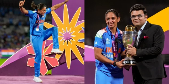 भारतीय महिला क्रिकेट टीम की कप्तान हरमनप्रीत कौर ने हाल ही में वर्ल्ड कप जीत के जश्न में जो दृश्य प्रस्तुत किया, वह सोशल मीडिया पर चर्चा का विषय बन गया। ट्रॉफी वितरण समारोह के दौरान हरमनप्रीत कौर भांगड़ा करते हुए मंच पर पहुंचीं, लेकिन भारतीय क्रिकेट कंट्रोल बोर्ड (BCCI) के सचिव जय शाह ने उन्हें ट्रॉफी के साथ पैर छूने से रोका।