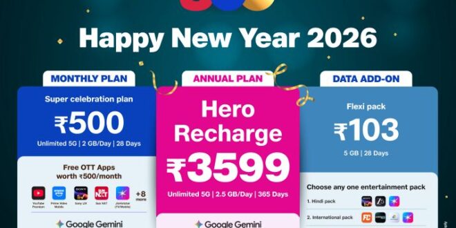 रिलायंस जियो ने नए साल 2026 के मौके पर अपने हैप्पी न्यू ईयर 2026 ऑफर्स की घोषणा की है। इन ऑफर्स के ज़रिए जियो ने एक बार फिर किफायती दामों पर उन्नत डिजिटल सेवाएं उपलब्ध कराने की अपनी प्रतिबद्धता को मज़बूत किया है। लंबी वैधता, अनलिमिटेड 5जी और प्रीमियम ओटीटी कंटेंट के साथ ये प्लान देशभर के करोड़ों ग्राहकों को बेहतर कनेक्टिविटी और एंटरटेनमेंट का अनुभव देने के उद्देश्य से पेश किए गए हैं।
