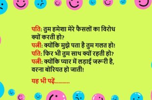 पति: आज ऑफिस में बॉस ने मुझे डांटा, बिल्कुल मूड खराब है। पत्नी: फिर भी घर आकर मुझसे बात कर रहा है, कितना कूल है! पति: कूल नहीं, डर के मारे चुप हूँ, वरना घर में तू मुझे डांटने वाली है!😆🤣🤣🤣🤣😝😝😝 ************************************************************************************ पत्नी: ये रिमोट हमेशा मेरे पास क्यों रहता है? पति: ताकि तुम्हें लगे मैं तुम्हें कंट्रोल करता हूँ। …