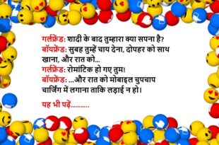 गर्लफ्रेंड: चलो मूवी देखते हैं! बॉयफ्रेंड: ठीक है, तुम्हें कौन सी पसंद है? गर्लफ्रेंड: कोई भी चलेगी, लेकिन VIP सीट होनी चाहिए। बॉयफ्रेंड: जानू, ये प्यार है या लोन की EMI?😆🤣🤣🤣🤣😝😝😝 ************************************************************************************ गर्लफ्रेंड: इस “Pooja” की हर फोटो पर तुमने Like क्यों किया है? बॉयफ्रेंड: मैं सबको करता हूं… गर्लफ्रेंड: अच्छा? अब देखो मैं किस-किस को “Block” करती हूं!😆🤣🤣🤣🤣😝😝😝 ************************************************************************************ …