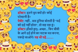 पेशेंट: डॉक्टर साहब, दिल में बहुत तेज़ दर्द हो रहा है। डॉक्टर (घबराकर): अरे! जल्दी से बताइए कब से हो रहा है? पेशेंट: जब से मेरी एक्स ने शादी की है… डॉक्टर: फिर ये कार्डियोलॉजिस्ट का नहीं, “साइकोलॉजिस्ट” का मामला है!😆🤣🤣🤣🤣😝😝😝 ************************************************************************************ डॉक्टर: ऑपरेशन बड़ा है, कोई आखिरी बात कहनी है? पेशेंट: हां, बीवी को बोलना… अब मायके जाकर आराम …