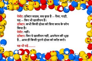 पेशेंट: डॉक्टर साहब, दिल बहुत भारी रहता है। डॉक्टर: क्या खाया था कल रात? पेशेंट: उसकी शादी की फोटो देखी थी… डॉक्टर: बेटा, ये एसिडिटी नहीं, यादों की जलन है।😆🤣🤣🤣🤣😝😝😝 ************************************************************************************ पेशेंट: डॉक्टर साहब, मम्मी दिन भर चुप रहती हैं, पहले बहुत बात करती थीं… डॉक्टर: आपने आख़िरी बार कब उनके पास बैठकर बिना मोबाइल के बातें कीं? पेशेंट: याद …