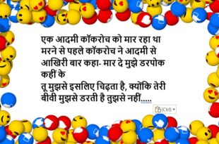 एक आदमी आया और सबसे बड़े साधु से पूछा- बीवी कंट्रोल नहीं होती क्या करूं बाबा? साधु (छोटे साधु से)- एक चटाई और लगा भाई के लिए….😆🤣🤣🤣🤣😝😝😝 ************************************************************************************ ससुर (दामाद से)- शादी के पहले तो तुम बहुत उपवास रखते थे दामाद- हां, सावन के सोमवार रखता था ससुर- तो अब क्या हुआ? दामाद- फिर आपकी बेटी से शादी हो गई …