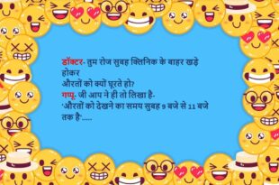 एक अमेरिकन डॉक्टर भारत आया बस स्टैंड के पास बुक स्टॉल पर एक किताब देखते ही उसे दिल का दौरा पड़ गया किताब का नाम था- ’30 दिन में डॉक्टर कैसे बनें’?😆🤣🤣🤣🤣😝😝😝 ************************************************************************************* डॉक्टर- तुम रोज सुबह क्लिनिक के बाहर खड़े होकर औरतों को क्यों घूरते हो? गप्पू- जी आप ने ही तो लिखा है- ‘औरतों को देखने का समय …