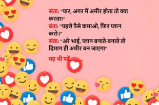 एक दिन मोहन अपने दोस्त के साथ ज्योतिष के पास गया। ज्योतिष: “तुम्हारी कुंडली में पैसे की कोई कमी नहीं।” मोहन: “ठीक है, लेकिन ये बताइए, यह पैसा ऑनलाइन ट्रांसफर कैसे करूं?” ज्योतिष: “ओह… यह तो मैंने नहीं बताया था।”😆🤣🤣🤣🤣😝😝😝 ************************************************************************************ पत्नी: “मैं एक पालतू खरगोश लेना चाहती हूं।” पति: “पता नहीं, क्यों खरगोश?” पत्नी: “ताकि जब तुम ऑफिस जाओ, …