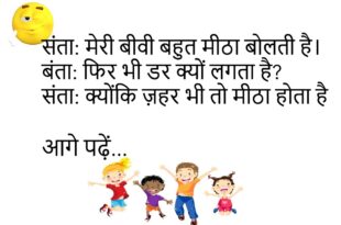 संता: मेरी बीवी बहुत मीठा बोलती है।बंता: फिर भी डर क्यों लगता है?संता: क्योंकि ज़हर भी तो मीठा होता है!😊😊😊😊 ****************************************** टीचर: अगर धरती घूमना बंद कर दे तो क्या होगा?छात्र: सर, फिर हम सब गिर जाएँगे — क्योंकि अब तक सबको घुमा रखा है!😊😊😊😊 ****************************************** बॉयफ्रेंड: तुम इतनी खूबसूरत कैसे लगती हो?गर्लफ्रेंड: फ़िल्टर ऑन है।😊😊😊😊 ****************************************** पति: आज खाना …