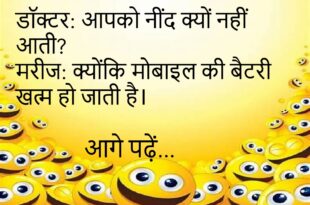 डॉक्टर: आपको नींद क्यों नहीं आती?मरीज: क्योंकि मोबाइल की बैटरी खत्म हो जाती है।😊😊😊😊 ****************************************** पत्नी: तुम मुझे कहाँ लेकर जाओगे शादी की सालगिरह पर?पति: कोर्ट! 😂 ****************************************** बच्चा: पापा, आप ऑफिस में क्या करते हो?पापा: बेटा, सबको बोलता हूँ काम करो।बच्चा: फिर आप क्या करते हो?पापा: वही जो तुम स्कूल में करते हो — मोबाइल चलाता हूँ!😊😊😊😊 ****************************************** पुलिस: …