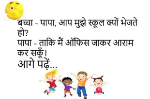 बच्चा – पापा, क्या मैं भगवान का बेटा हूँ?पापा – नहीं बेटा, भगवान का बेटा नहीं, मेहनत का बेटा है।😊😊😊😊😊 ****************************************** टीचर – सबसे बड़ा सागर कौन सा है?पप्पू – शादी का सागर, जिसमें सब डूब जाते हैं।😊😊😊😊😊 ****************************************** पत्नी – सुनो जी, मुझे सपना आया कि मैं बहुत अमीर हो गई।पति – तो वहीं रह जाना था।😊😊😊😊😊 ****************************************** डॉक्टर …
