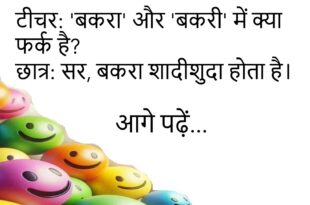टीचर: दो औरतें सड़क पर क्यों नहीं लड़ती? छात्र: क्योंकि पीछे से तीसरी आ जाती है।😊😊😊😊😊 ******************************************* टीचर: हिम्मत-ए-मर्दा मदद-ए-खुदा का मतलब? छात्र: मर्द खुद ही अपना काम करे!😊😊😊😊😊 ******************************************* टीचर: ‘बकरा’ और ‘बकरी’ में क्या फर्क है? छात्र: सर, बकरा शादीशुदा होता है।😊😊😊😊😊 ******************************************* टीचर: बताओ सबसे तेज कौन दौड़ता है? छात्र: पंखा, सर! टीचर: वो कैसे? छात्र: चलते …