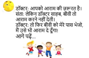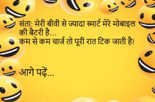 संता: भगवान सबको इतना पैसा क्यों नहीं देता कि कोई गरीब ना रहे? बंता: क्योंकि फिर अमीर कौन रहेगा? तू?😊😊😊😊😊 ******************************************* पप्पू: पापा, आप मुझे स्मार्टफोन कब दिलाओगे? पापा: बेटा, जब तू स्मार्ट हो जाएगा।😊😊😊😊😊 ******************************************* पति: डॉक्टर साहब, मुझे भूलने की बीमारी हो गई है। डॉक्टर: कब से? पति: कब से क्या?😊😊😊😊😊 ******************************************* पत्नी: तुम मुझे कहाँ-कहाँ घुमाओगे शादी …