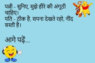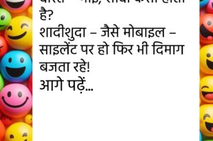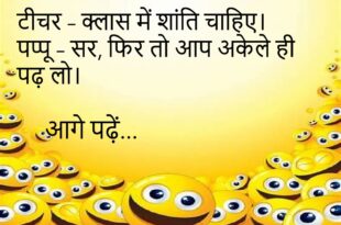 टीचर – बताओ, बिना बताए छुट्टी करना गुनाह है। पप्पू – नहीं सर, यह तो इंजीनियरिंग का पहला रूल है।😆 ********************************************** डॉक्टर – आपको आराम की ज़रूरत है। मरीज – लेकिन डॉक्टर साहब, मेरी बीवी आराम करने नहीं देती। डॉक्टर – तो बीवी को भी आराम की दवा दे दूँ? 😜 ********************************************** पति – तुमसे शादी करके मेरी ज़िंदगी बदल …