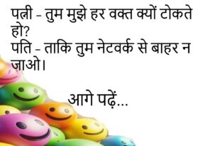 पत्नी – तुम मुझे हर वक्त क्यों टोकते हो? पति – ताकि तुम नेटवर्क से बाहर न जाओ।😊😊😊😊 ********************************************** पप्पू – मैं कक्षा का टॉपर बनूँगा। टीचर – बेटा, सपना छोटा रखो, बेल डोंगर तो बजा सकते हो।😊😊😊😊 ********************************************** पत्नी – ये सब्ज़ी में नमक क्यों नहीं है? पति – क्योंकि WhatsApp पे टाइप कर रहा था।😊😊😊😊 ********************************************** बच्चा – …