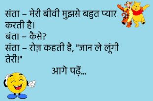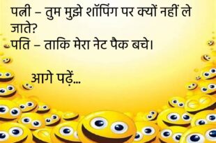 पत्नी – मैं मायके जा रही हूँ। पति – ठीक है, रास्ते में वाई-फाई बंद मत करना। 😜 ********************************************** डॉक्टर – आपकी तबीयत क्यों बिगड़ी? मरीज – जी, वज़न तोलने वाली मशीन ने बोला “Please One Person At A Time”! 🤣 ********************************************** गर्लफ्रेंड – तुम मुझे प्रपोज़ क्यों नहीं करते? बॉयफ्रेंड – वाई-फाई नहीं मिल रहा, कनेक्शन टूट रहा है। …