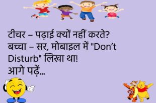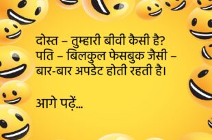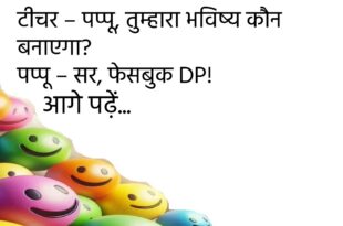 पत्नी – आप मुझे गोल्ड ज्वेलरी कब दोगे? पति – जब तुम्हारे फेसबुक लाइक्स 500 हो जाएँ! 😆 ********************************************** डॉक्टर – आपको नींद क्यों नहीं आती? मरीज – क्योंकि मोबाइल की बैटरी पूरी चार्ज होने तक सोता नहीं हूँ। 😜 ********************************************** टीचर – पढ़ाई क्यों नहीं करते? पप्पू – क्योंकि किताबें कहती हैं “Don’t Judge A Book By Its Cover”! …