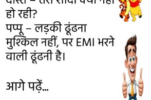 दोस्त – तेरी शादी क्यों नहीं हो रही? पप्पू – लड़की ढूंढना मुश्किल नहीं, पर EMI भरने वाली ढूंढनी है। 💸 ******************************************** पत्नी – मुझे सपना आया कि तुम मुझे हीरे का हार ला रहे हो। पति – तो सो जाओ, पूरा हो जाएगा। 😜 ******************************************** पप्पू – यार, मच्छर बहुत काट रहे हैं। गप्पू – भाई, बीवी के ताने …