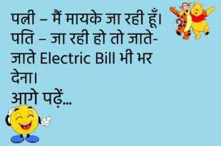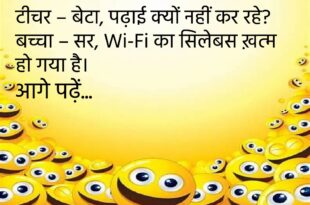 पत्नी – सुनो जी, मैं मायके जा रही हूँ। पति – ठीक है, जाते समय दरवाज़ा बंद कर देना।😊😊😊😊 ********************************* टीचर – बच्चो, बताओ नींद क्यों आती है? पप्पू – क्योंकि आँखें बंद करने का मन करता है।😊😊😊😊 ********************************* गर्लफ्रेंड – तुम मुझे कितना मिस करते हो? बॉयफ्रेंड – उतना जितना मोबाइल बिना चार्जर के करता है।😊😊😊😊 ********************************* पत्नी – …
