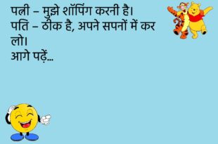 पत्नी – मुझे शॉपिंग करनी है। पति – ठीक है, अपने सपनों में कर लो।😊😊😊😊 ********************************* बच्चा – पापा, आप मुझे ATM क्यों नहीं दिखाते? पापा – बेटा, वो ATM नहीं है… वो तुम्हारी मम्मी है।😊😊😊😊 ********************************* टीचर – बेटा, ये जोकर क्यों रो रहा है? पप्पू – क्योंकि उसका मज़ाक खत्म हो गया।😊😊😊😊 ********************************* सास – खाना क्यों नहीं …