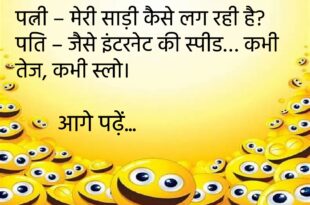 पत्नी – मेरी साड़ी कैसे लग रही है? पति – जैसे इंटरनेट की स्पीड… कभी तेज, कभी स्लो।😊😊😊😊 ********************************* बच्चा – मम्मी, आप हमेशा मुझे डांटती क्यों हो? मम्मी – क्योंकि तुम्हें सुनना आदत है।😊😊😊😊 ********************************* टीचर – बताओ, बिजली कहाँ से आती है? पप्पू – पड़ोसी के घर से।😊😊😊😊 ********************************* पत्नी – तुम मुझसे प्यार करते हो या नहीं? …