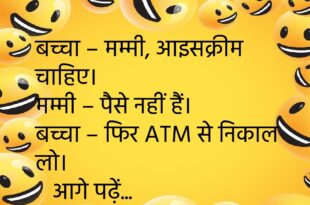 बच्चा – मम्मी, आइसक्रीम चाहिए। मम्मी – पैसे नहीं हैं। बच्चा – फिर ATM से निकाल लो।😊😊😊😊 ********************************* पत्नी – सुनो जी, मैं मायके जा रही हूँ। पति – रास्ते में ख्याल रखना।😊😊😊😊 ********************************* टीचर – बताओ, आलसी किसे कहते हैं? बच्चा – जो होमवर्क नहीं करता।😊😊😊😊 ********************************* गर्लफ्रेंड – मुझे क्या गिफ्ट दोगे? बॉयफ्रेंड – अपना वाई-फाई पासवर्ड।😊😊😊😊 ********************************* …