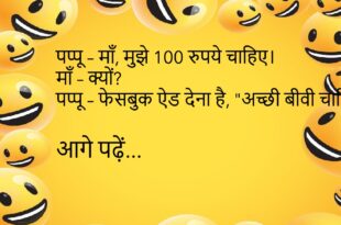 पप्पू – माँ, मुझे 100 रुपये चाहिए। माँ – क्यों? पप्पू – फेसबुक ऐड देना है, “अच्छी बीवी चाहिए।” 😂 **************************************************** पति – मुझे डर लगता है। पत्नी – किससे? पति – तुमसे। 🤣 **************************************************** बच्चा – पापा, आप इतने शांत क्यों रहते हो? पापा – बेटा, शादी के बाद आवाज़ कम करनी पड़ती है। 😂 **************************************************** पत्नी – सुनो …