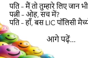 पति – मैं तो तुम्हारे लिए जान भी दे सकता हूँ। पत्नी – ओह, सच में? पति – हाँ, बस LIC पॉलिसी मैच्योर हो जाए पहले। 🤣 **************************************************** पप्पू – टीचर जी, मैं शादी नहीं करूँगा। टीचर – क्यों? पप्पू – क्योंकि मैंने मम्मी और पापा की ज़िंदगी देख ली है। 😂 **************************************************** पत्नी – सुनो जी, मुझे ड्राइविंग सीखनी …