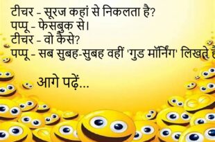 दोस्त – तुझे कभी प्यार हुआ है? पप्पू – हाँ, कई बार… पर हर बार गलती से ‘सेंड टू ऑल’ दब गया।😊😊😊😊 **************************************** गर्लफ्रेंड – तुम मुझे कितने मिस करते हो? बॉयफ्रेंड – उतने जितना तुम्हारे वॉट्सऐप का ‘लास्ट सीन’ देखता हूँ।😊😊😊😊 **************************************** टीचर – बताओ, आलसी किसे कहते हैं? पप्पू – जो सवाल पूछकर खुद ही जवाब न दे!😊😊😊😊 …