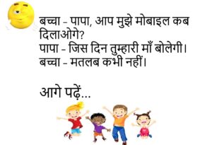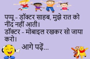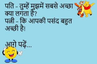 पत्नी – मैं मायके जा रही हूँ। पति – रास्ता भूल मत जाना।😊😊😊😊 *************************************** दोस्त – यार, बीवी से इतना डरते क्यों हो? पप्पू – क्योंकि डर ही सच्चा प्यार है।😊😊😊😊 *************************************** बच्चा – पापा, आप मुझे मोबाइल कब दिलाओगे? पापा – जिस दिन तुम्हारी माँ बोलेगी। बच्चा – मतलब कभी नहीं।😊😊😊😊 *************************************** पत्नी – मुझसे कितना प्यार करते हो? …