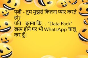 टीचर – परीक्षा में फेल क्यों हुए? छात्र – सर, पेन ही नहीं चल रहा था। टीचर – तो दूसरा पेन ले लेते। लड़का – क्या तुम मुझे मिस करती हो? लड़की – हाँ, तुम्हारे जाने के बाद खुशियाँ मिस करती हूँ।😊😊😊😊 *********************************** पत्नी – तुम मुझसे कितना प्यार करते हो? पति – इतना कि… “Data Pack” खत्म होने पर …