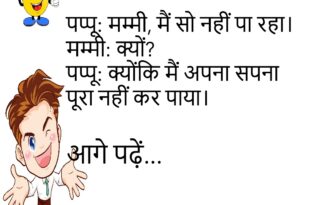 पप्पू: मम्मी, मैं सो नहीं पा रहा।मम्मी: क्यों?पप्पू: क्योंकि मैं अपना सपना पूरा नहीं कर पाया।😊😊😊😊 ************************************************** संता: डॉक्टर साहब, मुझे भूख नहीं लगती।डॉक्टर: क्या खा रहे हो?संता: सिर्फ डायट चार्ट।😊😊😊😊 ************************************************** पत्नी: सुनिए, आप मुझे देखकर खुश होते हैं।पति: हाँ, जब आप हँसती हैं।😊😊😊😊 ************************************************** शिक्षक: बताओ, सबसे तेज़ जानवर कौन सा है?छात्र: सर, इंटरनेट का डेटा!😊😊😊😊 ************************************************** पप्पू: …