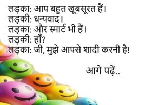 लड़का: आप बहुत खूबसूरत हैं।लड़की: धन्यवाद।लड़का: और स्मार्ट भी हैं।लड़की: हाँ?लड़का: जी, मुझे आपसे शादी करनी है!😊😊😊😊 ************************************************** संता: यार, तुम्हारी गाड़ी तो बहुत तेज़ है।बंता: हाँ, लेकिन ब्रेक भी उतने ही तेज़ हैं।😊😊😊😊 ************************************************** पप्पू: पापा, मैं नौकरी छोड़ दूँ क्या?पापा: क्यों बेटा?पप्पू: बॉस मुझे समझ ही नहीं पा रहा।पापा: बेटा, बॉस कभी तुम्हें समझेंगे नहीं, बस पैसों के …