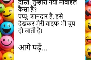 दोस्त: तुम्हारा नया मोबाइल कैसा है?पप्पू: शानदार है, इसे देखकर मेरी वाइफ भी चुप हो जाती है!😊😊😊😊 ************************************************** शिक्षक: पानी बिना जीवन संभव है क्या?छात्र: नहीं सर, बिजली बिल बिना भी जीवन मुश्किल है!😊😊😊😊 ************************************************** संता: डॉक्टर साहब, मुझे नींद नहीं आती।डॉक्टर: रात में सोते हो?संता: नहीं, दिन में सोता हूँ!😊😊😊😊 ************************************************** पप्पू: मम्मी, मेरा होमवर्क खो गया।मम्मी: फिर नया …