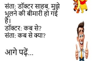 संता: डॉक्टर साहब, मुझे भूलने की बीमारी हो गई है। डॉक्टर: कब से? संता: कब से क्या?😊😊😊😊 ************************************************* पप्पू: मम्मी, मैं स्कूल नहीं जाऊँगा। मम्मी: क्यों? पप्पू: क्योंकि वहां बहुत पढ़ाई होती है। मम्मी: घर पर पढ़ाई नहीं होती? पप्पू: होती है, लेकिन वहां मम्मी डाँटती है, स्कूल में टीचर!😊😊😊😊 ************************************************* पति: सुनिए, आप मेरी शादी से खुश हैं? पत्नी: …