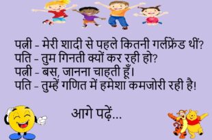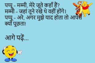 पत्नी – सुनो जी, अगर मैं मर गई तो क्या करोगे? पति – अरे पगली, मैं भी तेरे साथ मर जाऊँगा। पत्नी – झूठे! एक बार तो हँस के बोलो। पति – 🤣🤣🤣 *********************************** पप्पू – मम्मी, मेरे जूते कहाँ हैं? मम्मी – जहां तूने रखे थे वहीं होंगे। पप्पू – अरे, अगर मुझे याद होता तो आपसे क्यों पूछता!😊😊😊😊 …