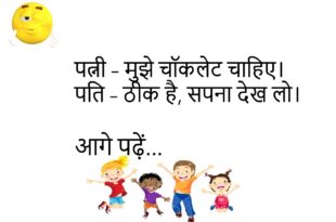 गोलू – मुझे लगता है मेरी बीवी मुझसे प्यार नहीं करती।मोनू – क्यों?गोलू – कल उसने चाय में चीनी डालना भूल गई… जहर भी नहीं डाला।😊😊😊😊 ****************************************** टीचर – ईमानदारी क्या होती है?पप्पू – पापा का कहना, “अभी पैसे नहीं हैं” और मम्मी का कहना, “हां है, पर तुम्हें नहीं देंगे”।😊😊😊😊 ****************************************** पत्नी – आज खाना कौन बनाएगा?पति – जो …