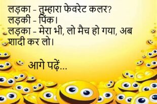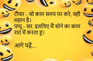 टीचर – कौन-सी गैस हमें हंसाती है?पप्पू – WhatsApp Status Gas।😊😊😊😊 ****************************************** पति – आज खाना बहुत स्वादिष्ट है।पत्नी – सच में?पति – हां, आज तुम्हें बनाने का मौका नहीं मिला न।😊😊😊😊 ****************************************** गोलू – मेरी गर्लफ्रेंड मुझे छोड़कर चली गई।मोनू – क्यों?गोलू – उसने कहा, “तुम मेरे सपनों के राजकुमार नहीं हो।”मोनू – तो?गोलू – मैंने भी कहा, “और …