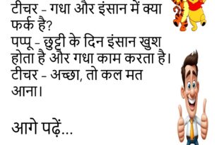 टीचर – पप्पू, पानी में नमक क्यों घुल जाता है?पप्पू – क्योंकि नमक को पानी में रहने की आदत है।😊😊😊😊 ****************************************** पत्नी – तुम मुझे गुलाब क्यों नहीं देते?पति – क्योंकि तुम्हारे कांटे मुझे चुभ जाते हैं।😊😊😊😊 ****************************************** गोलू – मैंने कल डाइटिंग शुरू की।मोनू – फिर?गोलू – शाम तक 3 बार शुरू की और 3 बार खत्म कर दी।😊😊😊😊 …