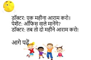डॉक्टर: क्या तकलीफ है? मरीज: बीवी से परेशान हूं! डॉक्टर: ये बीमारी तो मैं खुद झेल रहा हूं, अगला प्लीज़!😂😂😂😂😂 ********************************* टीचर: बताओ, सबसे मेहनती अंग कौन सा है? बच्चा: जी, जीभ… हर समय हिलती रहती है!😂😂😂😂😂 ********************************* पप्पू: मम्मी, मैं बड़ा होकर शादी करूंगा। मम्मी: शर्म नहीं आती! पप्पू: पर आप भी तो पापा से शादी करके फंसी हो!😂😂😂😂😂 …