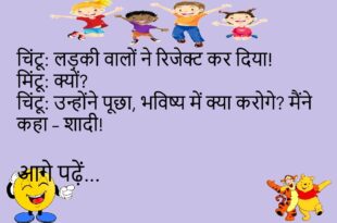 राजू: मुझे नौकरी करनी है। मैनेजर: क्या कर सकते हो? राजू: शादी के बाद भी खुश रह सकता हूं! मैनेजर: कमाल है! आप सीधा बॉस बनो!😊😊😊😊😊😊 ************************************************* पप्पू: प्यार अंधा होता है। गप्पू: शादी आंखें खोल देती है। पप्पू: फिर तलाक चश्मा बनवा देता है!😊😊😊😊😊😊 ************************************************* मोनू: मम्मी, पड़ोस वाले अंकल मुझे मारते हैं! मम्मी: क्यों बेटा? मोनू: क्योंकि मैं …