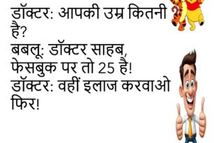 डॉक्टर: आपको क्या तकलीफ है? पप्पू: बीवी ताना मारती है! डॉक्टर: इलाज संभव नहीं… ये तो दुनिया की सबसे खतरनाक बीमारी है!😊😊😊😊😊😊 ************************************************* राजू: मम्मी ये मक्खी बार-बार खाने में गिर रही है। मम्मी: बेटा, इसे भी टेस्ट करना है कि खाना स्वादिष्ट है या नहीं!😊😊😊😊😊😊 ************************************************* टीचर: बताओ, अगर पृथ्वी से पानी खत्म हो गया तो क्या होगा? छात्र: …