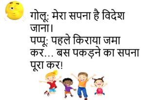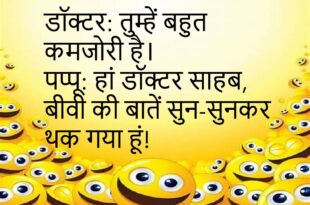 गोलू: मैं इतना स्मार्ट हूं कि बिना चश्मे के भी चीजें देख सकता हूं। पप्पू: अगर तुम स्मार्ट हो, तो बिना अकल के भी क्यों चलते हो?😊😊😊😊😊 *********************************************** पति: तुम हमेशा मोबाइल में क्यों लगी रहती हो? पत्नी: मैं तुम्हारे बारे में गूगल कर रही हूं। पति: क्या ढूंढ रही हो? पत्नी: “कैसे बदलें रिश्ते को और बेहतर?”😊😊😊😊😊 *********************************************** पप्पू: …