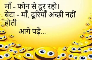 मम्मी – “इतनी मिठाई क्यों खाई?”बच्चा – “आज मेरी खुशी का दिन है।”😊😊😊😊 **************************************** टीचर – “इतना होशियार कैसे हो?”छात्र – “होशियार तो हूँ, बस पढ़ाई कम कर दी।”😊😊😊😊 **************************************** दोस्त – “तुम गाना सुनते हो या गाते हो?”दोस्त 2 – “सुनता हूँ।”दोस्त – “गाते समय भी सुनते हो?”😊😊😊😊 **************************************** पति – “तुम बहुत बदल गई हो।”पत्नी – “नजर बदल …
