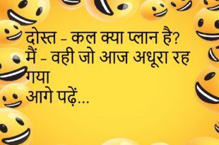 पत्नी – आप मुझसे कुछ छुपा रहे हो? पति – हाँ। पत्नी – क्या? पति – चैन 😜 ******************************************* डॉक्टर – नींद पूरी लेते हो? मरीज़ – जी, वीकेंड में 😆 ******************************************* दोस्त – टाइम मैनेजमेंट कैसा है? मैं – टाइम मुझे मैनेज करता है 😄 ******************************************* टीचर – सवाल समझ आया? छात्र – जी। टीचर – जवाब? छात्र – …