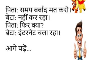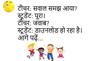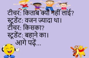 टीचर: सबसे तेज क्या भागता है?स्टूडेंट: समय।टीचर: कैसे?स्टूडेंट: छुट्टी के दिन उड़ जाता है।😄😄😄😄 **************************************** पत्नी: फोन में क्या देख रहे हो?पति: मौसम।पत्नी: रोज़?पति: मूड का।😄😄😄😄 **************************************** दोस्त: आज खुश क्यों है?लड़का: सैलरी आई।दोस्त: फिर उदास क्यों?लड़का: कटौती याद आई।😄😄😄😄 **************************************** डॉक्टर: एक्सरसाइज करते हो?मरीज: रोज़।डॉक्टर: कौन सी?मरीज: मोबाइल ढूंढने की।😄😄😄😄 **************************************** टीचर: किताब क्यों नहीं लाई?स्टूडेंट: वजन ज्यादा था।टीचर: …