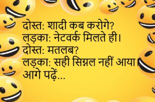 पत्नी: फोन किससे बात कर रहे थे?पति: नेटवर्क से।पत्नी: झूठ?पति: कॉल ड्रॉप हो गई।😄😄😄😄 **************************************** दोस्त: फोन क्यों गिर गया?लड़का: किस्मत स्लिप हुई।दोस्त: स्क्रीन भी?लड़का: सपने भी।😄😄😄😄 **************************************** मां: कमरे में क्या कर रहे हो?बेटा: ज्ञान बढ़ा रहा हूँ।मां: कैसे?बेटा: वीडियो देखकर।😄😄😄😄 **************************************** बॉस: छुट्टी क्यों चाहिए?कर्मचारी: दिमाग रिचार्ज करना है।बॉस: चार्जर?कर्मचारी: नींद।😄😄😄😄 **************************************** दोस्त: खाना कैसा बना?लड़का: शानदार।दोस्त: सच?लड़का: …