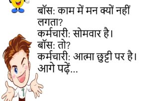 दोस्त: पढ़ाई कब करेगा?लड़का: मूड बनते ही।दोस्त: कब बनेगा?लड़का: रिजल्ट के बाद।😄😄😄😄 **************************************** पत्नी: क्या सोच रहे हो?पति: भविष्य।पत्नी: कैसा?पति: EMI वाला।😄😄😄😄 **************************************** बॉस: काम में मन क्यों नहीं लगता?कर्मचारी: सोमवार है।बॉस: तो?कर्मचारी: आत्मा छुट्टी पर है।😄😄😄😄 **************************************** दोस्त: इतना सज क्यों रहा है?लड़का: फोटो डालनी है।दोस्त: कहाँ?लड़का: फिल्टर के भरोसे।😄😄😄😄 **************************************** टीचर: सबसे तेज कौन दौड़ता है?स्टूडेंट: अफवाह।टीचर: कैसे?स्टूडेंट: …