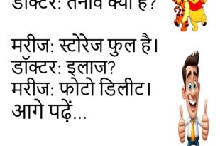 दोस्त: नींद पूरी हुई?लड़का: हाँ।दोस्त: कितनी?लड़का: सपना टूटने तक।😄😄😄😄 ***************************************** टीचर: सबसे कठिन विषय कौन सा?स्टूडेंट: भविष्य।टीचर: क्यों?स्टूडेंट: रिजल्ट पहले नहीं मिलता।😄😄😄😄 ***************************************** पत्नी: शॉपिंग चलें?पति: बैंक बैलेंस से पूछो।पत्नी: फोन दूँ?पति: बेहोशी मत दिलाओ।😄😄😄😄 ***************************************** दोस्त: फोन स्लो क्यों है?लड़का: उम्र हो गई है।दोस्त: किसकी?लड़का: चार्जर की।😄😄😄😄 ***************************************** डॉक्टर: तनाव क्यों है? मरीज: स्टोरेज फुल है।डॉक्टर: इलाज?मरीज: फोटो डिलीट।😄😄😄😄